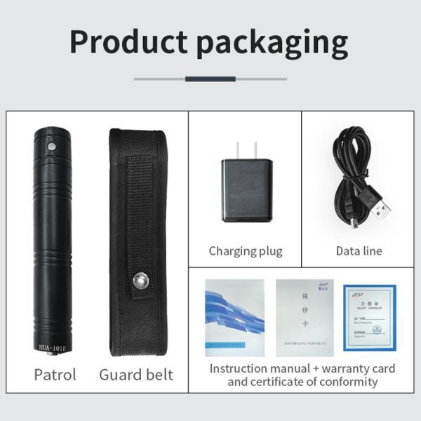 Introducing the remarkable performance of the HUA-101E product: featuring a robust super aluminum alloy structure with surface hard oxidation treatment, it is designed to be anti-fall and waterproof, ensuring durability in demanding environments. With a generous data storage capacity of 60,000 records, expandable to 120,000 records if needed, this device eliminates the hassle of USB driver installation for data transmission. Simply plug and play using the convenient USB communication mode. The HUA-101E excels in non-contact induction card reading, with a reading distance of 3-5 cm. Its efficient polymerized physical battery boasts a capacity of 650 mA. When reading cards, the device provides successful card reading feedback through lights and vibration prompts. Notably, the product's power consumption is minimal, with a standby current of within 0.12 milliampere and a power consumption of 0.45 milliwatt. With compact dimensions of 150x26mm and a lightweight design of 125g, the HUA-101E combines portability and functionality seamlessly. Experience the exceptional performance of the HUA-101E for efficient security patrol operations.
